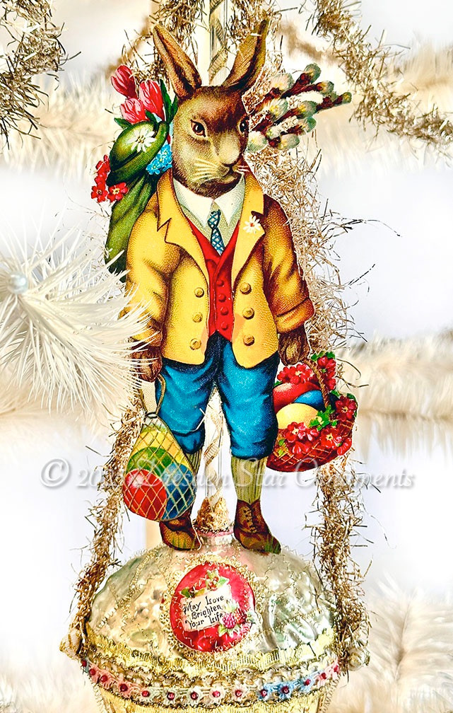 Even though he’s big, he still displays nicely between the branches of our 44” feather trees (sold separately on our website). Mr. Bunny carries egg treats in both paws, and totes Spring pussy-willows and tulips in his knapsack. He looks right at home on this wonderful large rare mid-century glass basket ornament which is decorated with antique multicolored tatting, tiny glass red beads, metallic antique tinsel decorations and loops of fancy decorative wire.