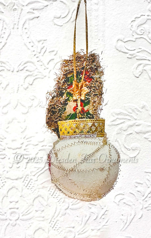 THIS ONE-OF-A-KIND ORNAMENT IS MADE ALMOST EXCLUSIVELY WITH ANTIQUE AND VINTAGE MATERIALS to include: glass ornaments from the 1890s to1950s, most of which were made in Germany; colorful Victorian embossed & die-cut paper “scraps” and chromolithographs from postcards and advertising trade cards, made in Europe between the 1870s and 1910; antique and vintage fabric to include chenille, lace, ribbon and metallic trims; antique and vintage tinsel from tree garlands and old-stock German-made Lametta tinsel; gold and silver old-stock Dresden paper trims, crepe paper, foil, gift wrap, spun glass, and other embellishments. Items described as “antique” are dated between 1870 and the early 1900s (prior to WWI). Items described as “vintage” are dated between 1915 (WWI) and the 1950s (mid-century). We also use Dresden trims (only on occasion) and crinkle wire (always used for durability) made more recently in Germany using techniques and equipment that have not changed over the past 150 years.
