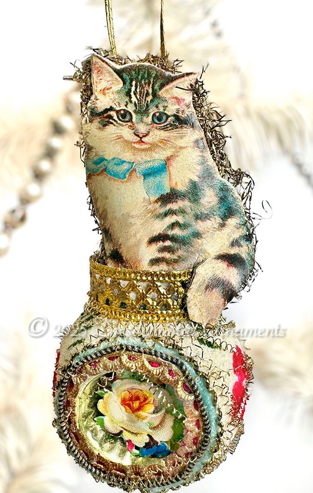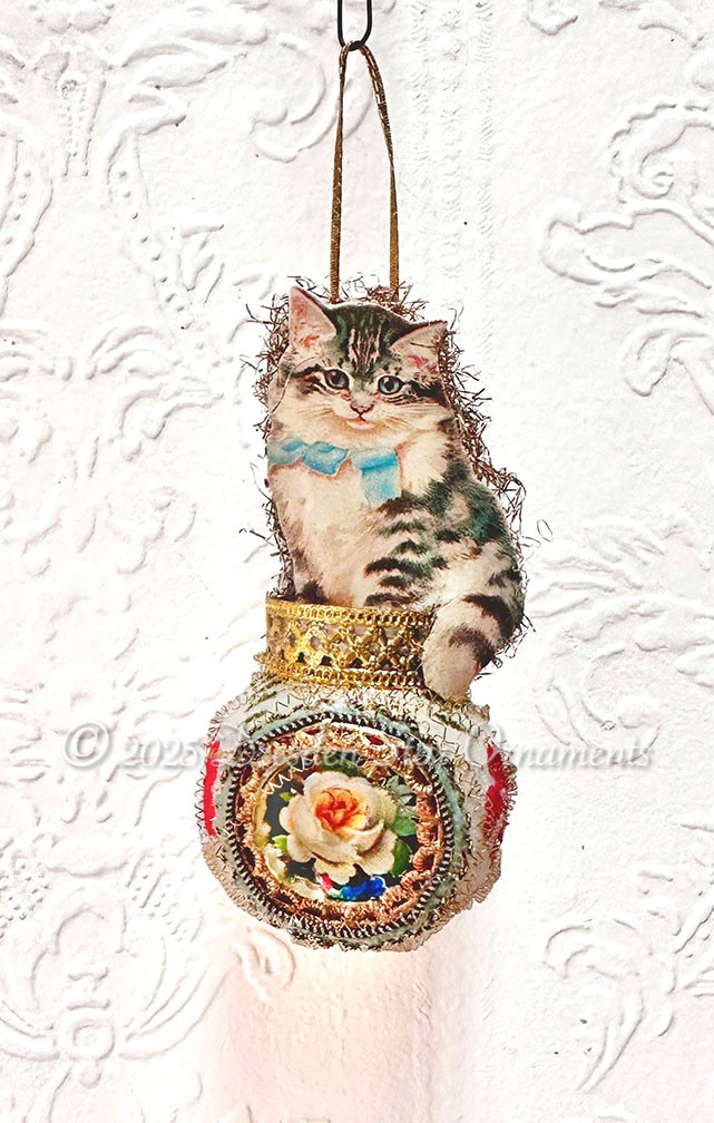 This sweet kitty has the perfect balance of decorations. I started with a pretty small frosted indent with green reflective center and original painted red flowers. I made a little gold fence like a little basket, tucked the kitty inside, and framed a beautiful scrap cabbage rose with delicate trims.