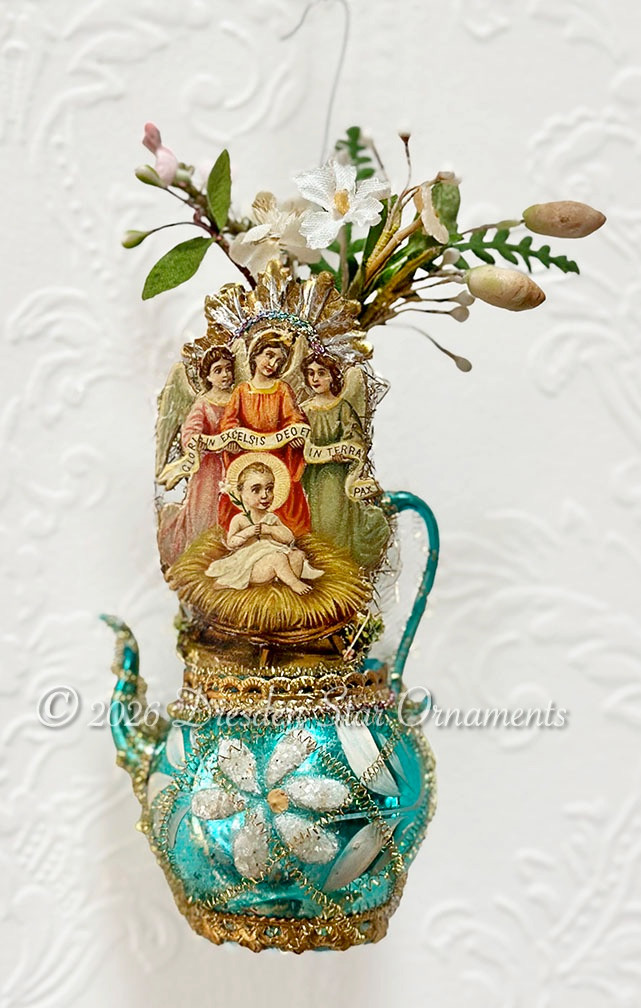Sweet little manger scene with baby Jesus is tucked into a hand-blown figural glass urn ornament from the 1930s (culled from a wonderful art deco ornament collection we recently purchased). I enjoyed rimming the top and bottom with little golden Dresden paper borders and took my time crafting the perfect bouquet from my millinery floral collection, to include tiny ferns, century-old was flower buds and gorgeous rare fabric apple blossoms from a Victorian bridal veil. I added my own halo to the scene for the final touch.
