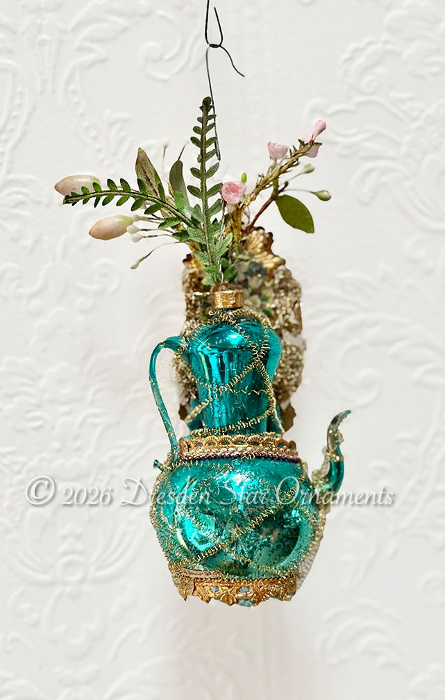 Since many of our creations contain glass ornaments that are as much as 120 years old, the condition and patina will vary, which this is part of their vintage one-of-a-kind charm and character. Items described as “antique” are dated between the 1870s and 1920. Items described as “vintage” are dated between the 1920s and the 1950s (mid-century). We also use newer Dresden trims (on occasion) and crinkle wire (to wire-wrap ornaments for durability) made more recently in Germany using techniques and equipment that have not changed over the past 150 years.