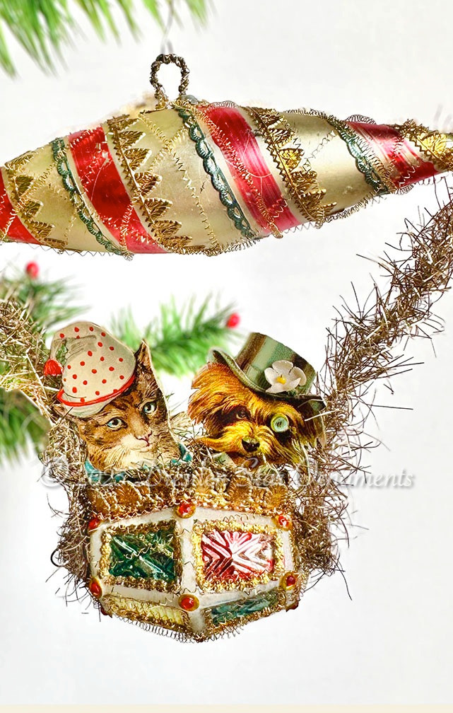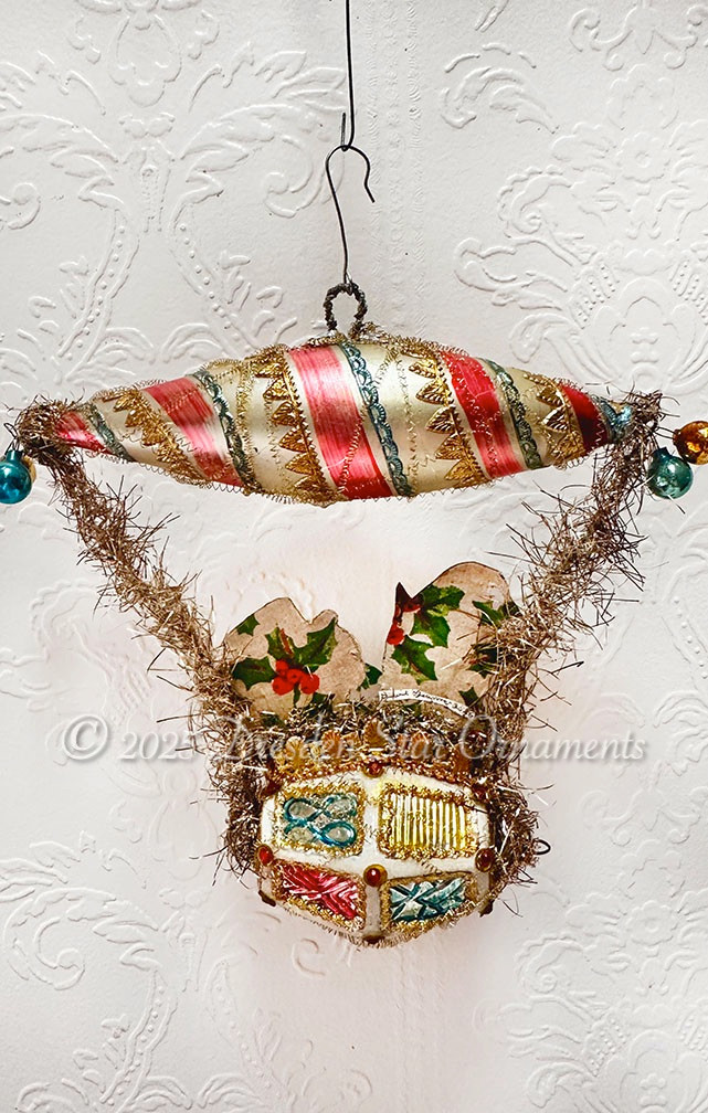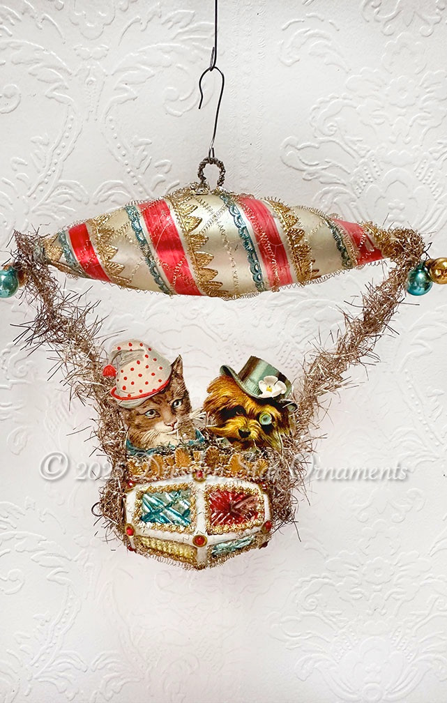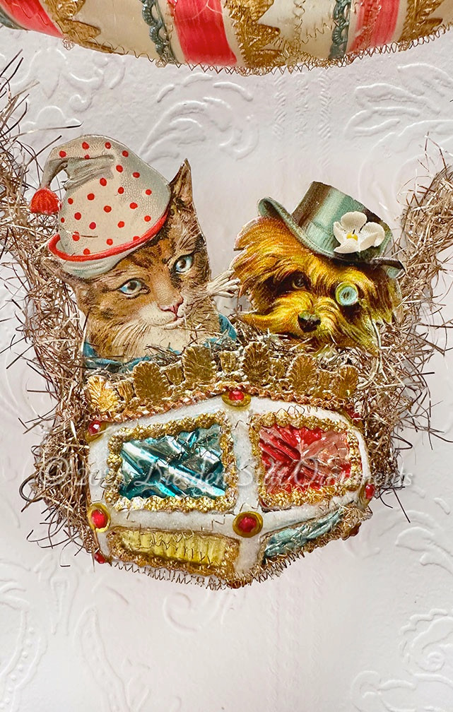 If you love character animals and ornaments that travel in the sky (popular Victorian motifs), this ornament is for you! With yellow, coral pink, and robin’s egg blue throughout it’s very playful and fun. The cat and monocled dog characters were my inspiration. I tucked them inside a multifaceted glass barrel ornament and added trims studded with sequins and rhinestones on all 16 sides. I decorated a candy striped glass icicle ornament with gold and blue Dresden paper trims. Then I used tinsel garland to attach the glass basket to the dirigible. Miniature blue and gold balls dangle on each end for a perfect finish.