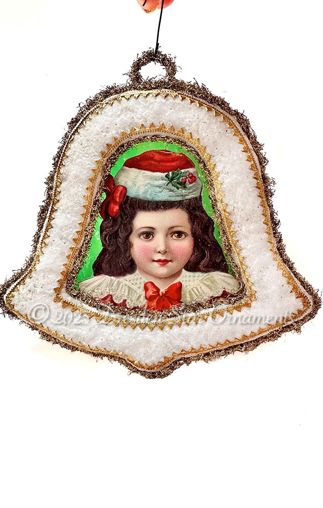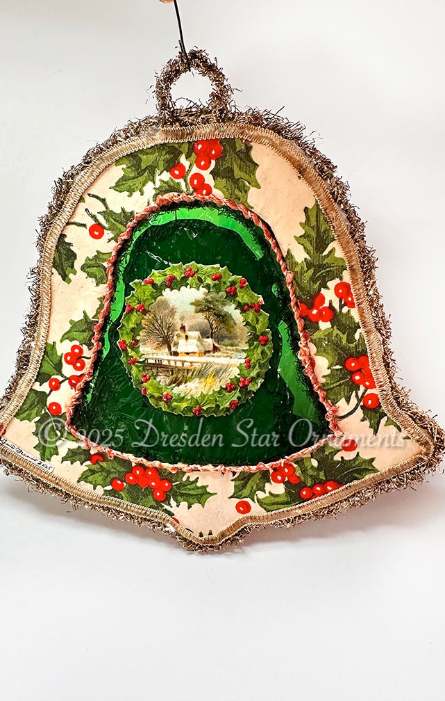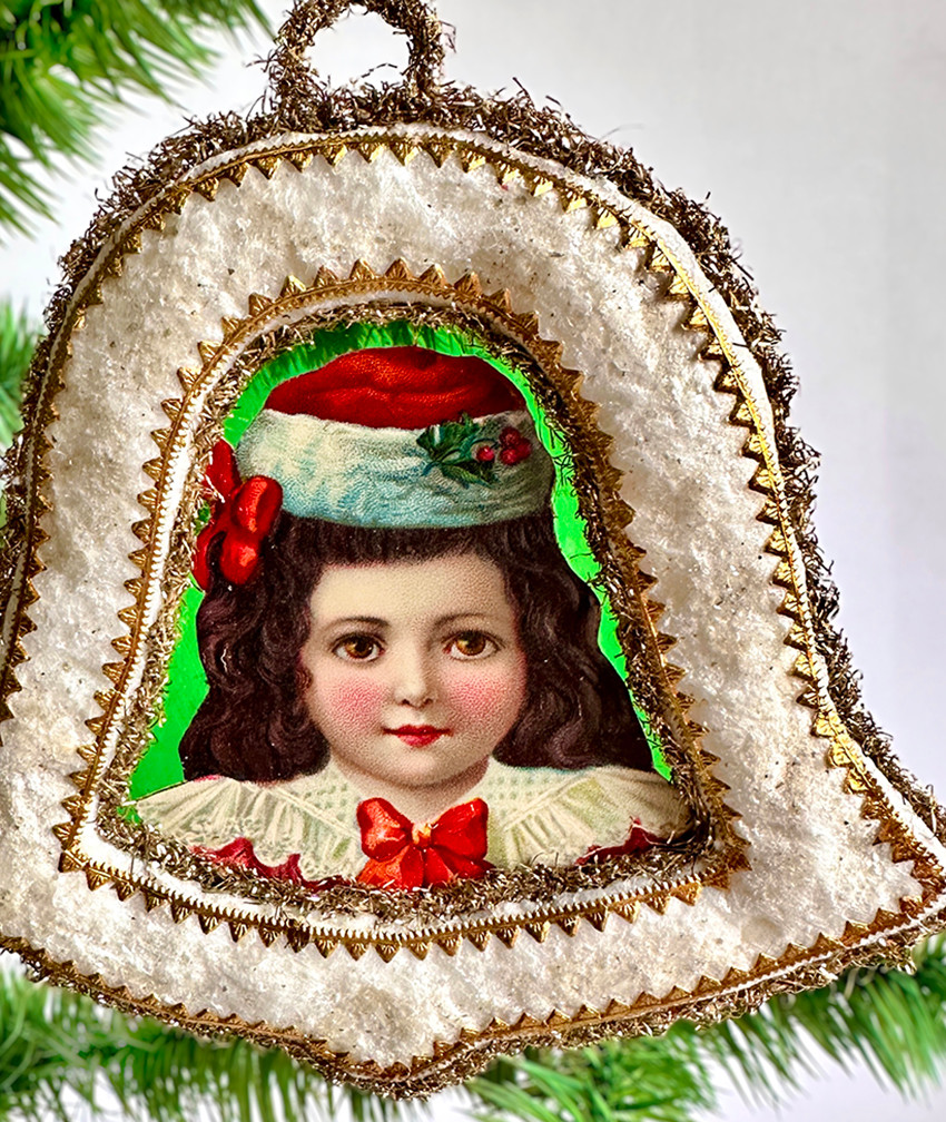 I am inspired by the home-crafted ornaments made by families in their parlors during the Victorian era. As I created this ornament (with cardboard, antique cotton batting from an old quilt, sparkling mica glitter and a pretty girl from a post-card), I imagined a family, heads together, leaning over a parlor table, sorting through beautiful postcards and die-cut “scraps” and cutting out fanciful cardboard shapes to go with them. Popular shapes like stars, bells, heaven’s gate, crosses, anchors and hearts, were wrapped in cotton batting and decorated with metal tinsel garland and Dresden paper borders, stars, and other little colorful scraps. Like always, I enjoyed decorating the back with antique Christmas wapping paper and adorable winter scene framed in a holly wreath.