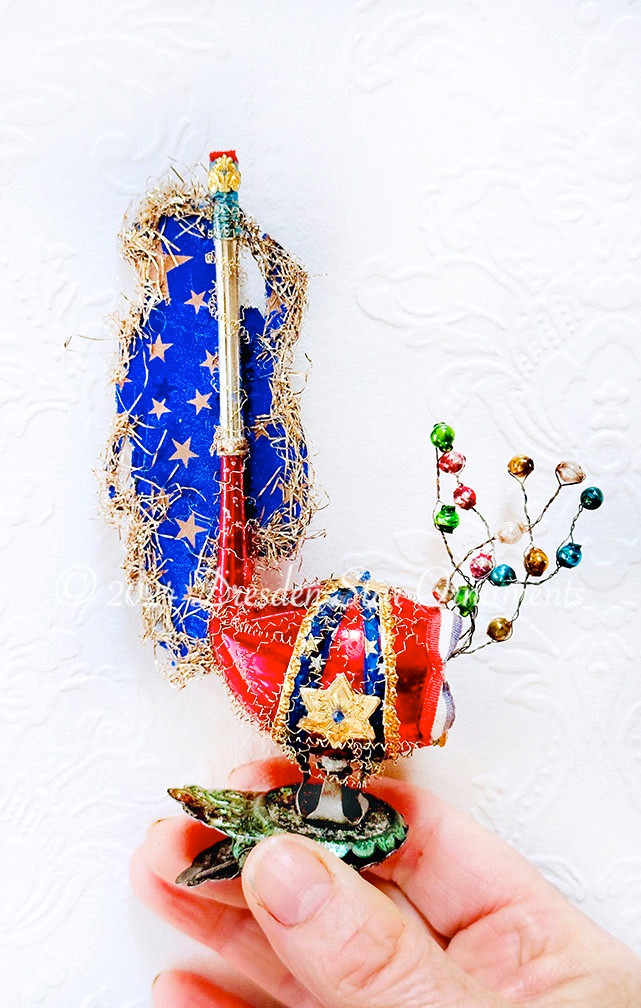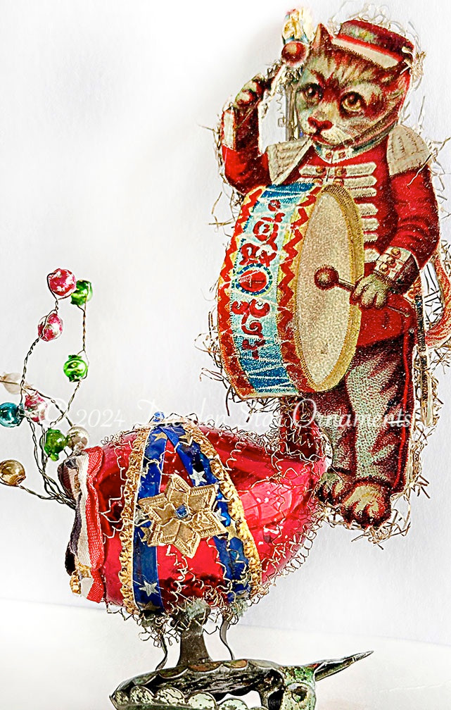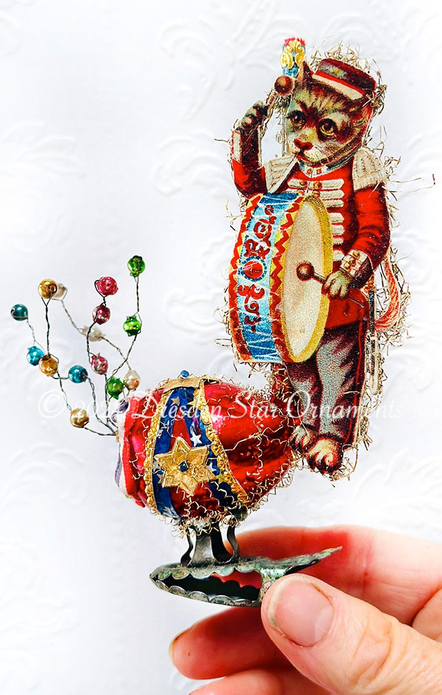 An adorable tabby cat in full uniform attire is keeping pace with his drum as he marches in a parade. Glenn selected perfectly fun patriotic details for this antique glass pipe ornament, including patriotic stars and small-scale red-white-and-blue ribbon. Tiny multicolored glass beads dance from the pipe in joyful celebration.