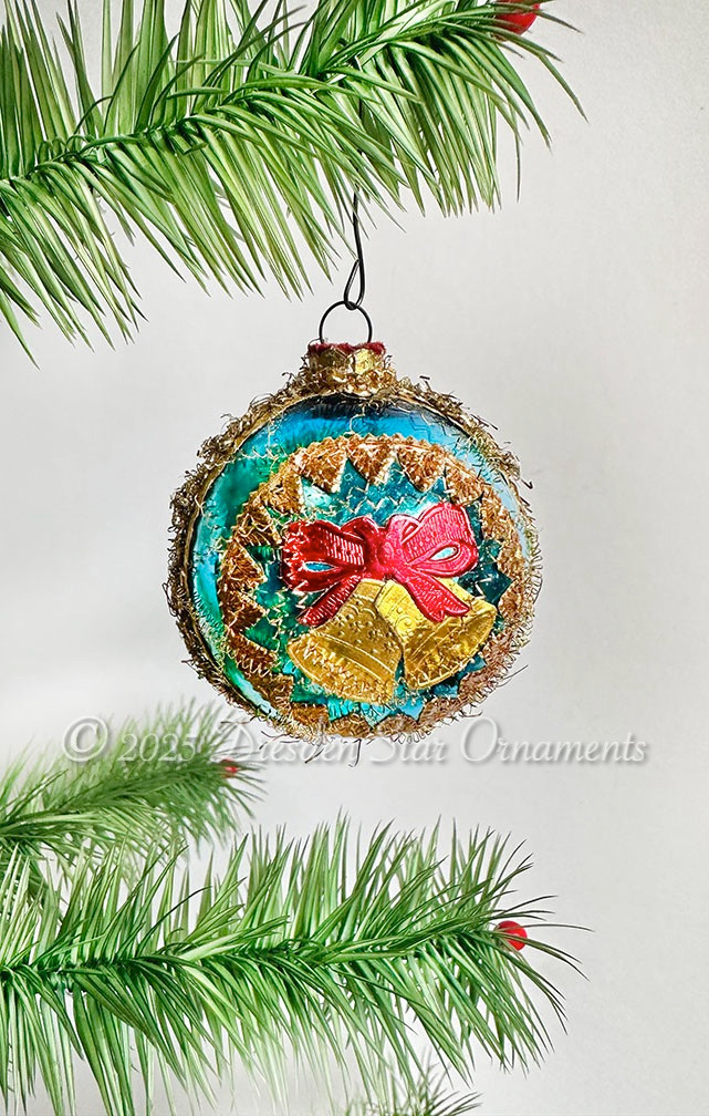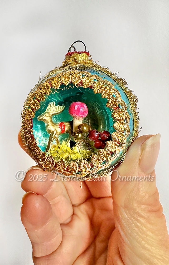 These little indent ornaments are designed to reflect color onto the little 3-D scenes inside. This one had the original mushroom and glass beads and I added the tiny mid-century reindeer and small branch. Dresden paper trims add magic and Dresden paper bells and Red foil Ribbon adorn the back side