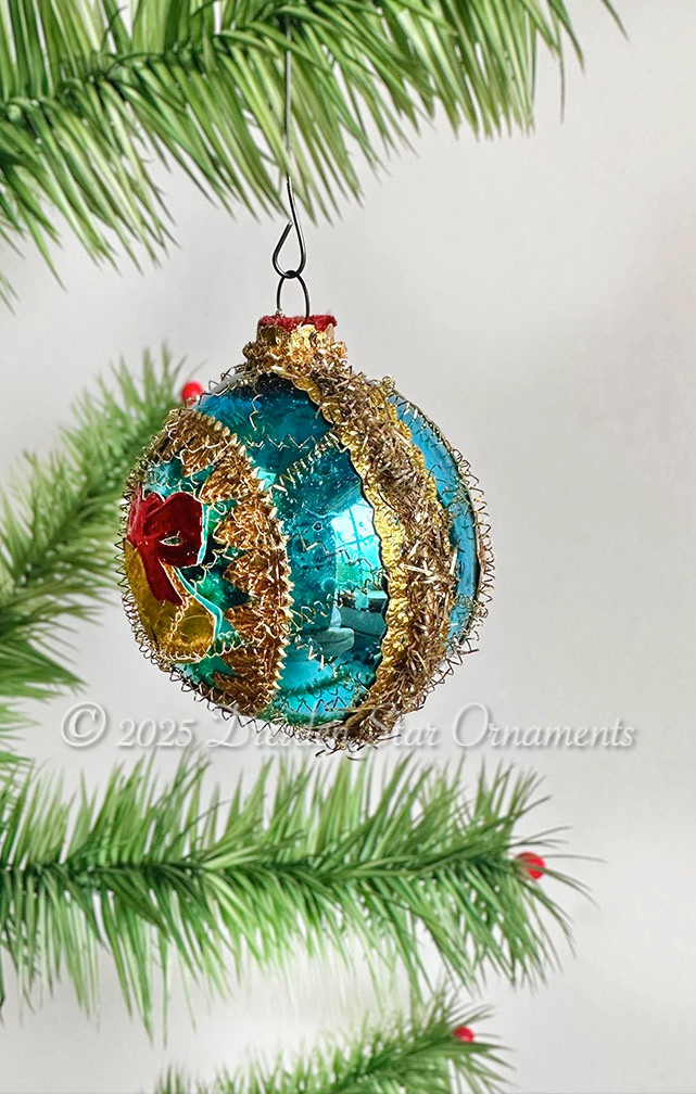 THIS ONE-OF-A-KIND ORNAMENT IS MADE ALMOST EXCLUSIVELY WITH ANTIQUE AND VINTAGE MATERIALS to include: glass ornaments from the 1890s to1950s, most of which were made in Germany; colorful Victorian embossed & die-cut paper “scraps” and chromolithographs from postcards and advertising trade cards, made in Europe between the 1870s and 1910; antique and vintage fabric to include chenille, lace, ribbon and metallic trims; antique and vintage tinsel from tree garlands and old-stock German-made Lametta tinsel; gold and silver old-stock Dresden paper trims, crepe paper, foil, gift wrap, spun glass, and other embellishments. Items described as “antique” are dated between 1870 and the early 1900s (prior to WWI). Items described as “vintage” are dated between 1915 (WWI) and the 1950s (mid-century). We also use Dresden trims (only on occasion) and crinkle wire (always used for durability) made more recently in Germany using techniques and equipment that have not changed over the past 150 years.