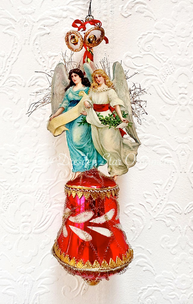 I love the Christmassy look and red, blue and white throughout this ornament. The blue pike ornament matches the brunette angel and the little white occupied Japan miniature bells match blonde one. Red ribbon running up the pole ties the bells to the top of the ornament. The Dresden paper chevron accents showcase a wonderful old glass bell with spindle bottom.