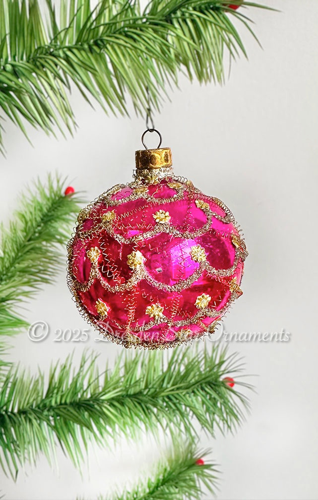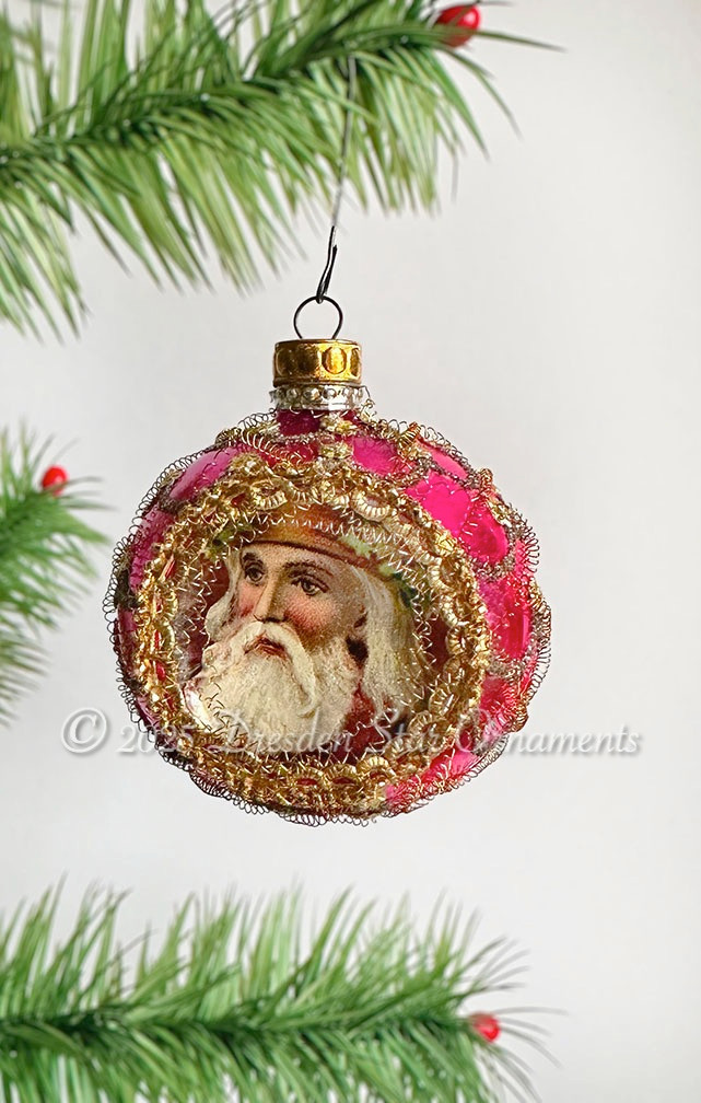 THIS ONE-OF-A-KIND ORNAMENT IS MADE ALMOST EXCLUSIVELY WITH ANTIQUE AND VINTAGE MATERIALS to include: glass ornaments from the 1890s to1950s, most of which were made in Germany; colorful Victorian embossed & die-cut paper “scraps” and chromolithographs from postcards and advertising trade cards, made in Europe between the 1870s and 1910; antique and vintage fabric to include chenille, lace, ribbon and metallic trims; antique and vintage tinsel from tree garlands and old-stock German-made Lametta tinsel; gold and silver old-stock Dresden paper trims, crepe paper, foil, gift wrap, spun glass, and other embellishments. Items described as “antique” are dated between 1870 and the early 1900s (prior to WWI). Items described as “vintage” are dated between 1915 (WWI) and the 1950s (mid-century). We also use Dresden trims (only on occasion) and crinkle wire (always used for durability) made more recently in Germany using techniques and equipment that have not changed over the past 150 years.