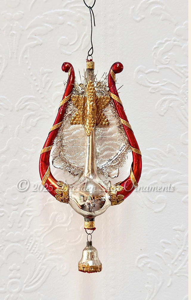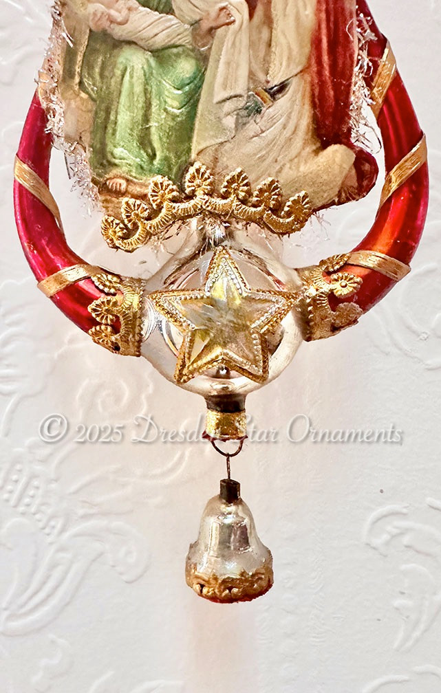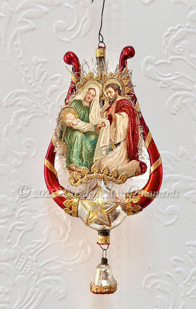 I’m excited about my rare find of beautiful antique Lyre (harp) ornaments that I recently snagged from a collector! This one is absolutely stunning in silver and amber-red. I found one of my favorite delicate scrap illustrations of Mary, Joseph, and baby Jesus, gave hem gold halo treatments and nestled them in the lyre. Golden Dresden papers, silver star, and my last miniature silver bell (so hard to find) finished off this ornament beautifully.