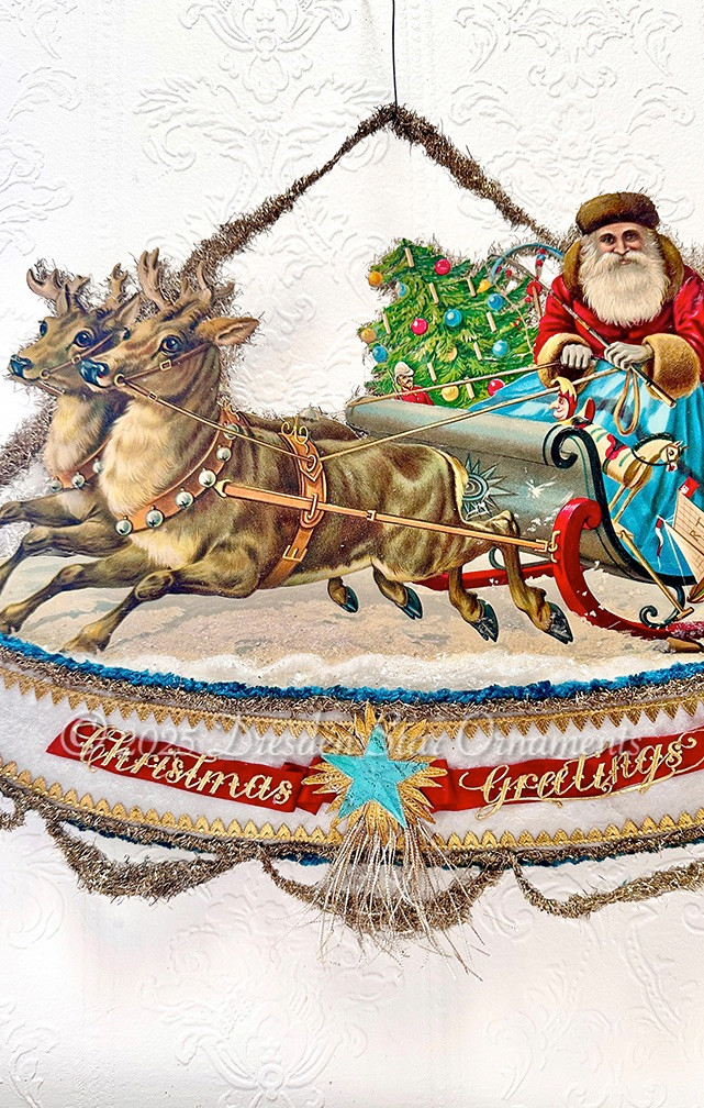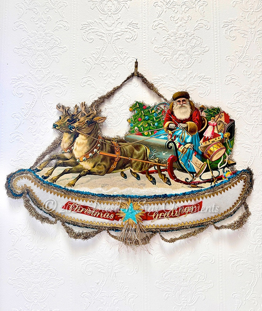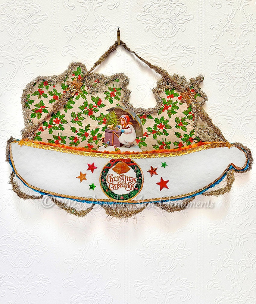 This rare 14 inch wide scrap is in amazing condition considering that it is over 150 years old. Santa, sleigh laden with toys, and two reindeer were just too big to pair with a glass ornament (to say the least). I used my imagination and made a two-part cardboard “boat”, covering the pieces with antique cotton batting before putting them together. The swag tinsel roping (garland) is Victorian era and is called bump tinsel. It makes beautiful loops along the bottom and follows the sides in a triangle shape to frame Santa. Blue chenille matches the color of Santa’s lap robe, Rare Dresden paper “Christmas Greeting” script is backed with antique silk red ribbon, and trims finish off the boat shape to tie it in with the colors of the illustration.