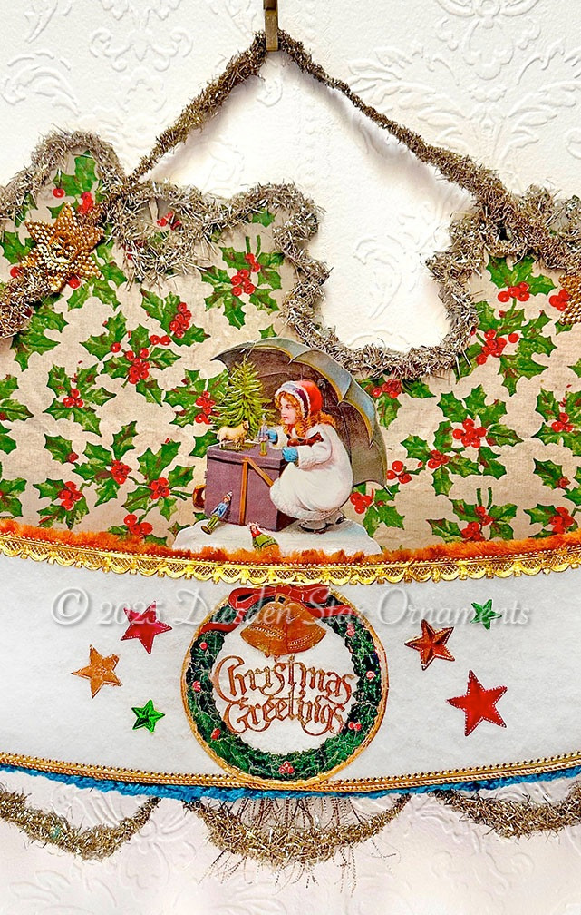 THIS ONE-OF-A-KIND ORNAMENT IS MADE ALMOST EXCLUSIVELY WITH ANTIQUE AND VINTAGE MATERIALS to include: glass ornaments from the 1890s to1950s, most of which were made in Germany; colorful Victorian embossed & die-cut paper “scraps” and chromolithographs from postcards and advertising trade cards, made in Europe between the 1870s and 1910; antique and vintage fabric to include chenille, lace, ribbon and metallic trims; antique and vintage tinsel from tree garlands and old-stock German-made Lametta tinsel; gold and silver old-stock Dresden paper trims, crepe paper, foil, gift wrap, spun glass, and other embellishments. Items described as “antique” are dated between 1870 and the early 1900s (prior to WWI). Items described as “vintage” are dated between 1915 (WWI) and the 1950s (mid-century). We also use Dresden trims (only on occasion) and crinkle wire (always used for durability) made more recently in Germany using techniques and equipment that have not changed over the past 150 years.