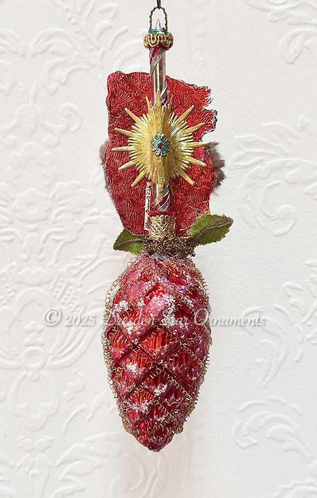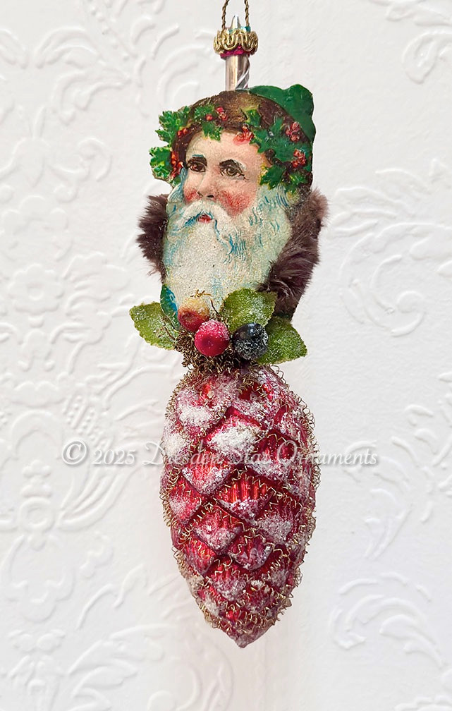 Beautiful orange-red frosted pinecone is a perfect match for Santa. Glenn added a collar of real fur, vintage millinery fruit and leaves, and added glitter for wintry sparkle!