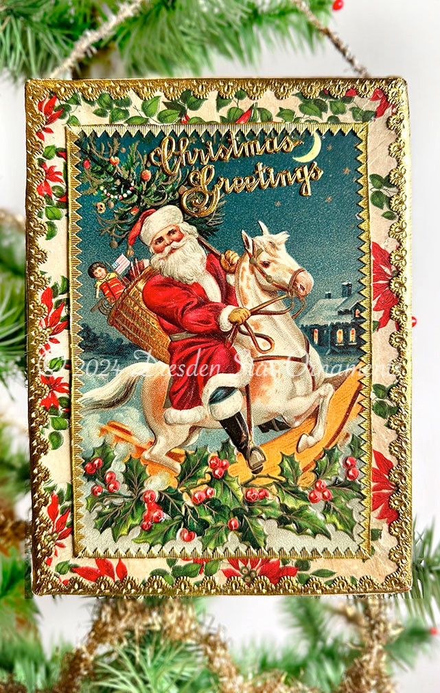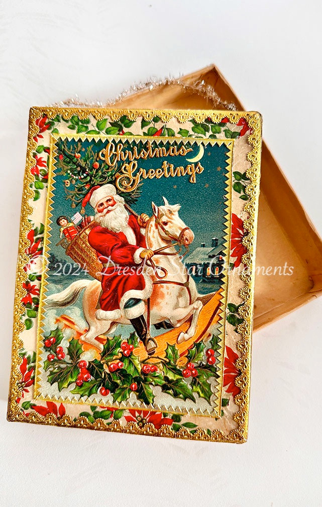 Candy containers like this one are reminiscent of the Victorian passion for boxes and cornucopias that families hung on Christmas night with treats for children to discover in the morning. I have had this collectible rare postcard for a long time and my dream for this one was to pair it with an old paper Christmas box, which I modified to fit the dimensions of the postcard without ruining the 120+ year old poinsettia paper. I incorporated my own Christmas Greeting script and framed the whole box and sides with exquisite Dresden trims.