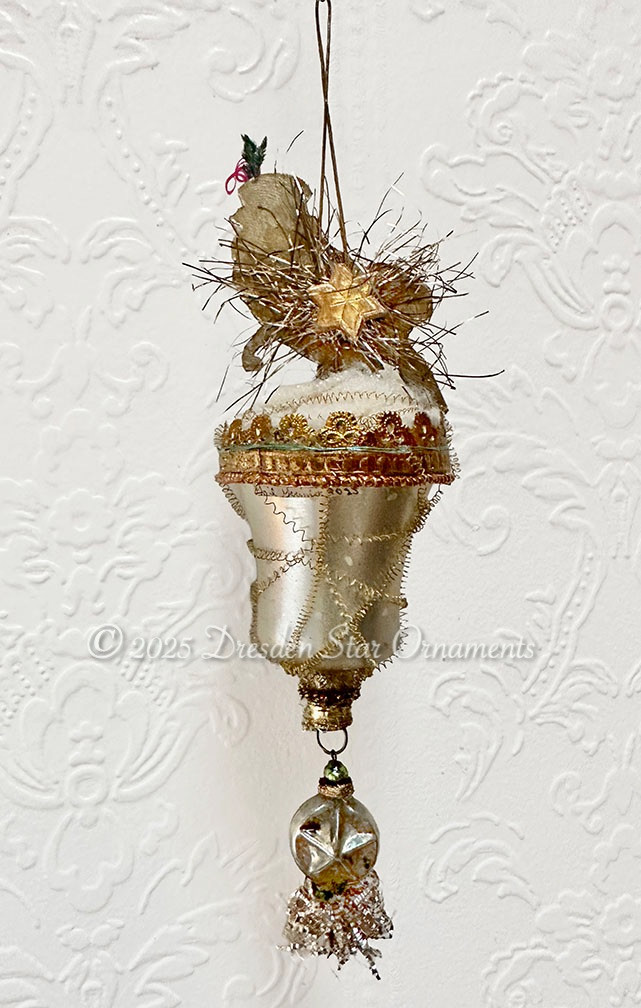 Just Imagine, You are Viewing an Ornament made with Materials 60 to 150 Years Old! Dresden Star Ornaments are almost exclusively made with antique and vintage materials to include: glass ornaments from the 1890s to1950s (most of which were made in Germany); colorful Victorian embossed & die-cut paper “scraps” and chromolithographs from postcards and advertising trade cards (made in Europe between the 1870s and 1910); antique and vintage fabric to include chenille, lace, ribbon and metallic trims; antique and vintage tinsel from tree garlands and old-stock German-made Lametta tinsel; gold and silver old-stock Dresden paper trims, crepe paper, foil, gift wrap, spun-glass, and other embellishments.