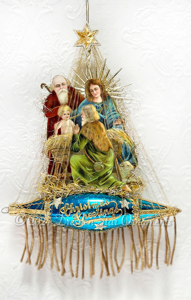 Just Imagine, You are Viewing an Ornament made with Materials 60 to 150 Years Old! Dresden Star Ornaments are almost exclusively made with antique and vintage materials to include: glass ornaments from the 1890s to1950s (most of which were made in Germany); colorful Victorian embossed & die-cut paper “scraps” and chromolithographs from postcards and advertising trade cards (made in Europe between the 1870s and 1910); antique and vintage fabric to include chenille, lace, ribbon and metallic trims; antique and vintage tinsel from tree garlands and old-stock German-made Lametta tinsel; gold and silver old-stock Dresden paper trims, crepe paper, foil, gift wrap, spun-glass, and other embellishments.