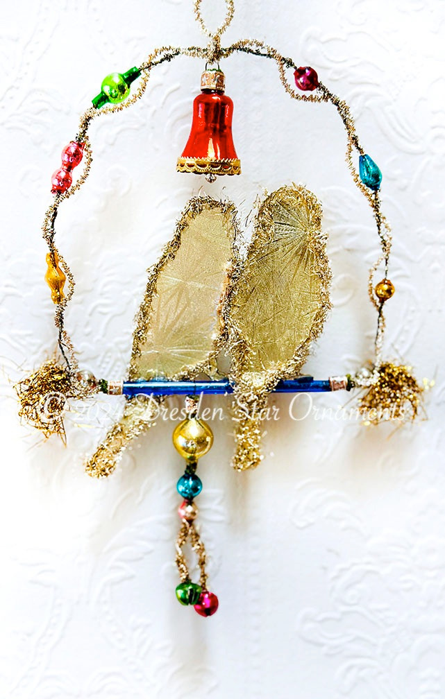 These playful canaries, perch, bells and toys look so lifelike, that they could belong in a real birdcage! I balanced a pair of beautiful scrap birds on a perch made with antique blue glass rod and wired tinsel that I decorated with vintage beads and old-stock German decorative wire (steifkantille). I had fun adding a miniature glass bell with original glass clapper (it actually rings) and mid-century jingle bells!