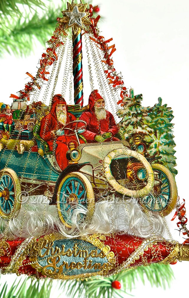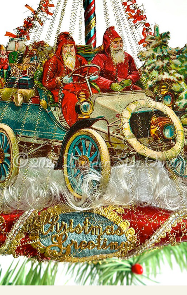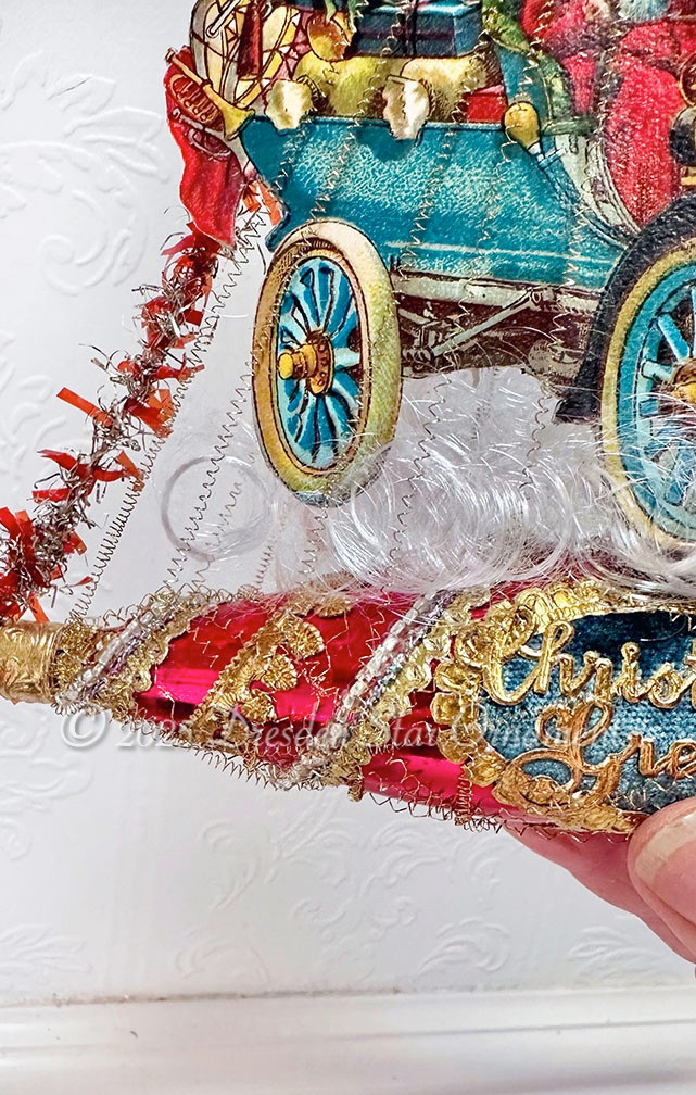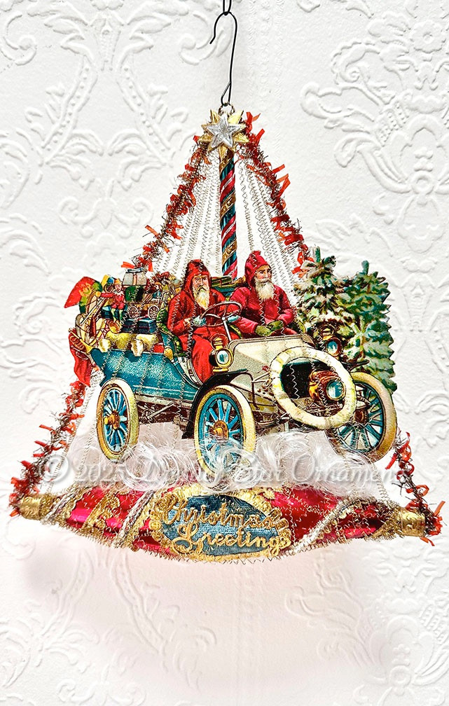 This ornament speaks to a sparkling Christmas Eve; a single star with with crinkle-wire beams down on a pair of Santas delivering toys to all the children (sans reindeer)! An imaginative early 1900s scrap - featuring one of the then new “horseless carriages” - is laden with toys and two Santa’. I suppose one Santa drives and the other delivers! Glenn matched a beautiful Glass teardrop ornament to the rich red of Santas’ cloaks and decorated it with spirals of sparkly antique iridescent glass beadwork, Dresden Papers and Christmas Greetings script. The spun glass “snow”, golden crinkle-wire, and beads will sparkle and shine under your tree lights.