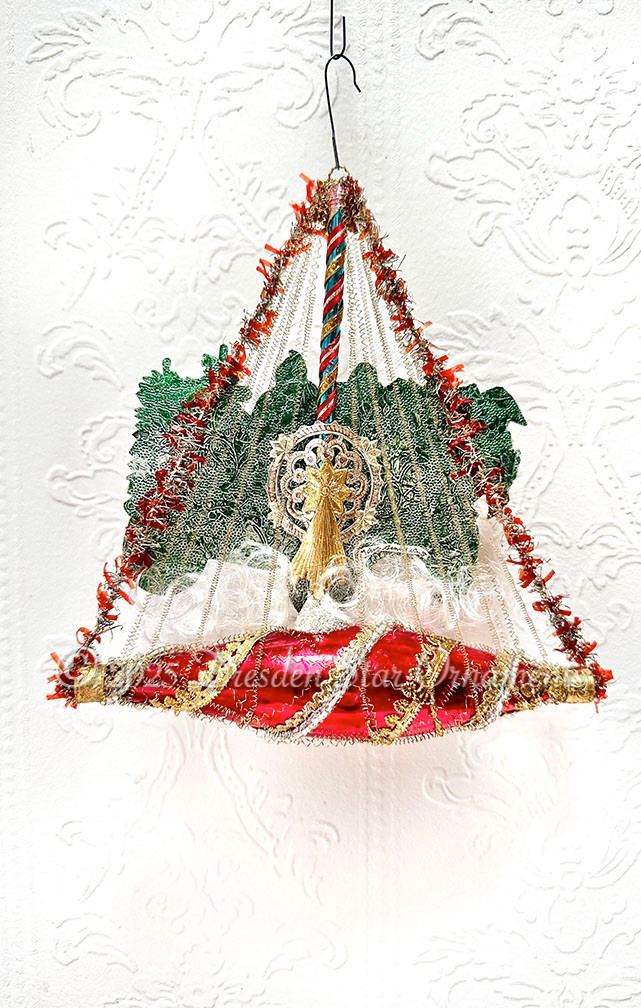 THIS ONE-OF-A-KIND ORNAMENT IS MADE ALMOST EXCLUSIVELY WITH ANTIQUE AND VINTAGE MATERIALS to include: glass ornaments from the 1890s to1950s, most of which were made in Germany; colorful Victorian embossed & die-cut paper “scraps” and chromolithographs from postcards and advertising trade cards, made in Europe between the 1870s and 1910; antique and vintage fabric to include chenille, lace, ribbon and metallic trims; antique and vintage tinsel from tree garlands and old-stock German-made Lametta tinsel; gold and silver old-stock Dresden paper trims, crepe paper, foil, gift wrap, spun glass, and other embellishments. Items described as “antique” are dated between 1870 and the early 1900s (prior to WWI). Items described as “vintage” are dated between 1915 (WWI) and the 1950s (mid-century). We also use Dresden trims (only on occasion) and crinkle wire (always used for durability) made more recently in Germany using techniques and equipment that have not changed over the past 150 years.