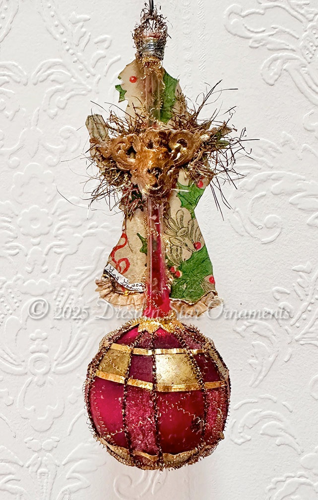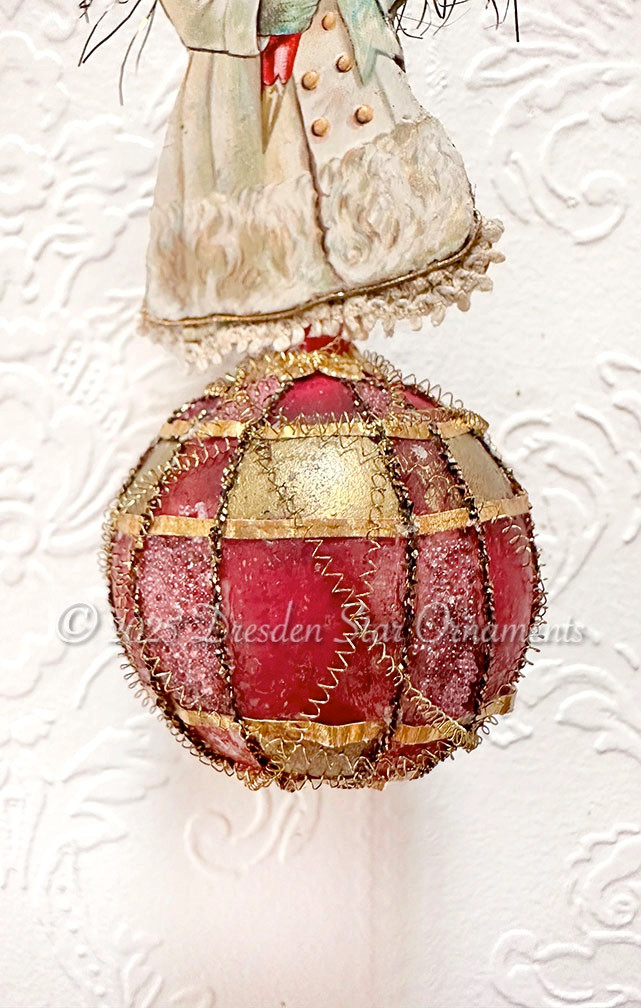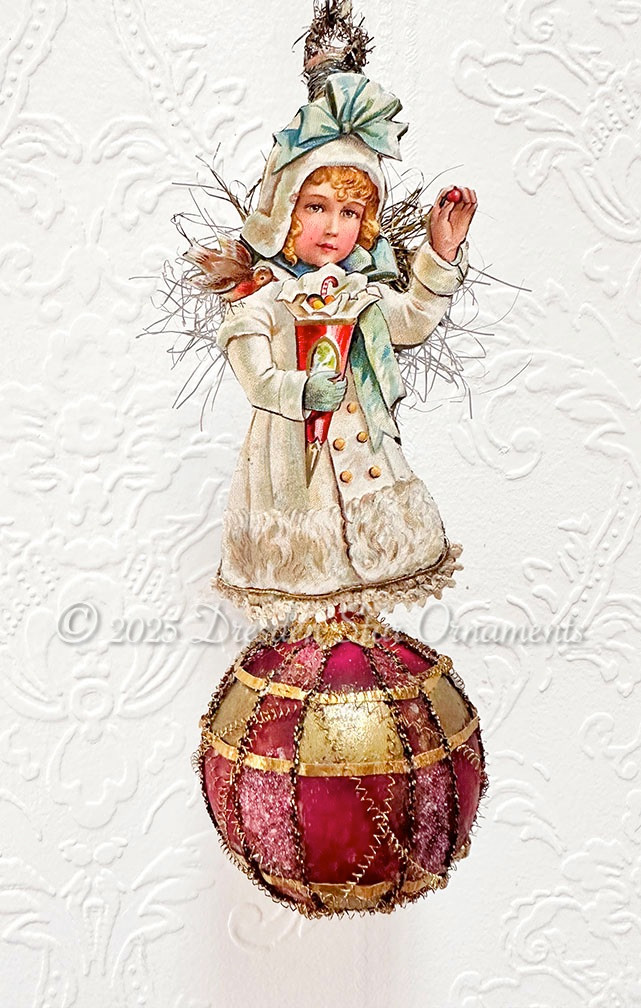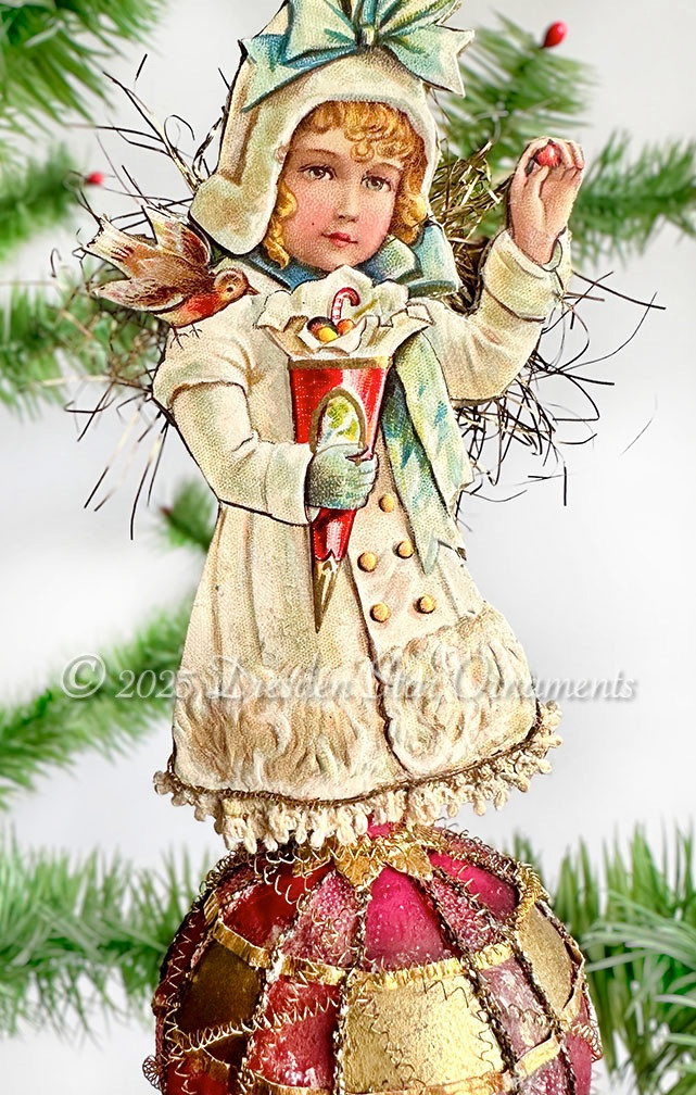 This is one of my favorites ever because I just adore this wonderful Victorian era illustration. She is holding a cone that looks like it could be a Dresden Star ornament! To the bottom hem of her adorable winter coat I added gold cording and Victorian lace (see closeup). She is perfect with this wonderful old Victorian glass ornament with it’s original pike intact and pink paint that aged to a dark dusty rose color. I then added antique gold paper strips and metallic cording.