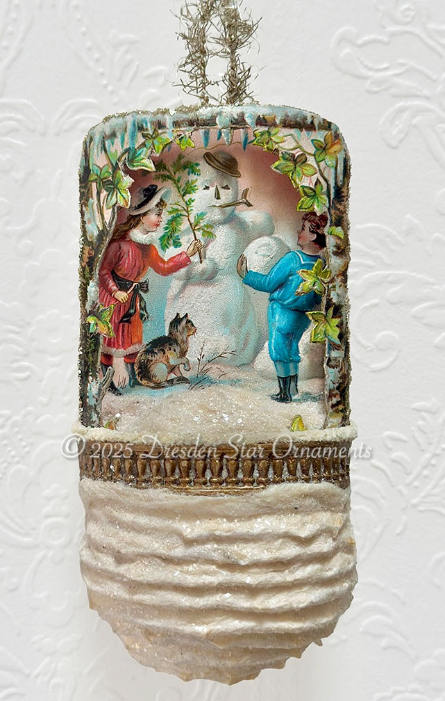 I was inspired to create a diorama ornament by carefully creating two separate die-cuts out of one Victorian-era postcard. (See photo). The top layer is the trees and branches which frames the back layer - the children making a snowman. I backed the trees with pretty reflective metallic rose-pink paper so they would cast a rosy glow on the scene when lit by a Christmas tree bulb just at the right angle! I have had this rare 100+ year old spun cotton snowball ornament (with its original sparkles) in my collection for decades and it was the perfect size to create a snowy foundation. It took hours of careful planning, positioning of antique cotton and all kinds of tiny clear glass glitter and mica flakes to create this snow scene. I added my own Victorian-era railing, giving it a bronzy finish to look like a metal fence and added freshly fallen snow on the fence.