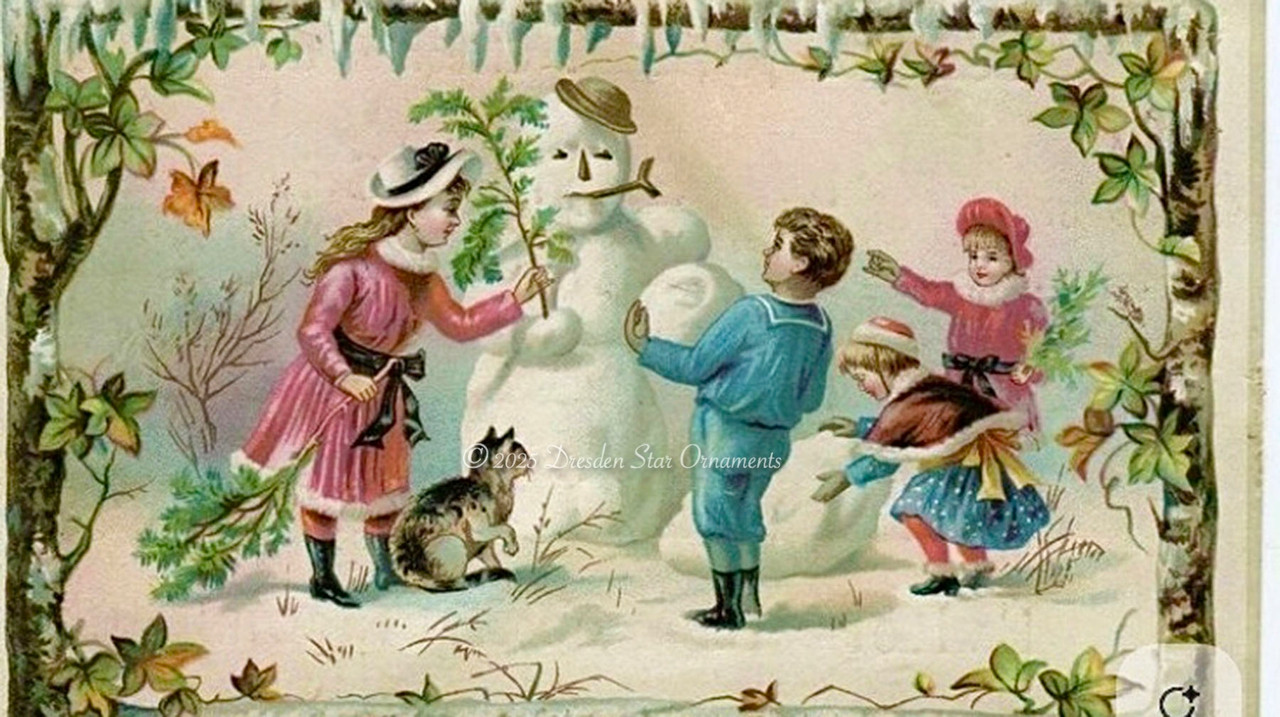 6 1/2” Tall x 3” Wide ~ View pics to see how I created this ornament out of an original postcard, spun-cotton snow ball, and Dresden paper fencing and my own cotton batting and special glitters